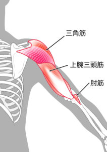 肩の後ろから肘の後ろにかけて筋肉を上腕三頭筋といいますが、この筋肉の肘につく腱の部分が炎症を起こすので上腕三頭筋腱炎と呼ばれています。