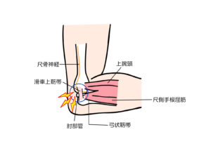 肘の内側にある肘部管の中を通る尺骨神経を圧迫することによって症状ですが、小指や薬指にシビレや痛みが起きます。