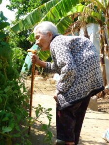 老化によって筋肉が硬くなり、さらに腰が曲がると重心が前に移動するので、膝に負担がかかります。