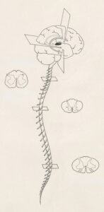 矯正は首だけではなく、肩甲骨や鎖骨はもちろん背骨や骨盤まで行います。脊髄を保護している硬膜は、後頭部と上部の頚椎から背骨を通って骨盤まで達し、仙骨にくっついていますので、首が急に大きく前に振られると仙骨まで引っ張られるのです。